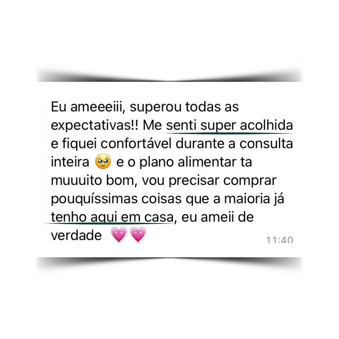 - Você já sai da consulta com seu plano alimentar individualizado, lista de compras e materiais de acompanhamento